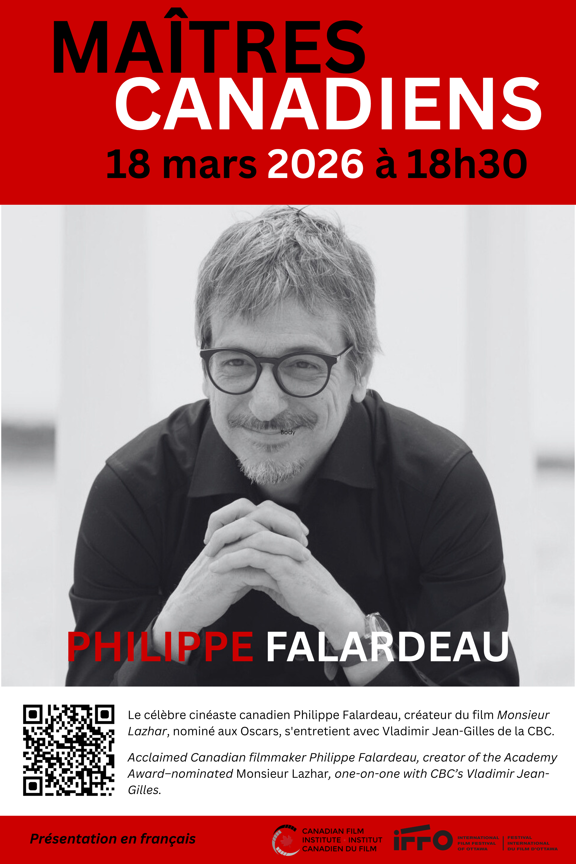 Les Canadian Masters Series de l’Institut canadien du film sont une célébration de l’excellence de la cinématographie canadienne, qui comporte des entrevues en profondeur sur scène, des projections spéciales et des discussions entre le public et certains des plus grands noms de l’histoire du film au Canada.